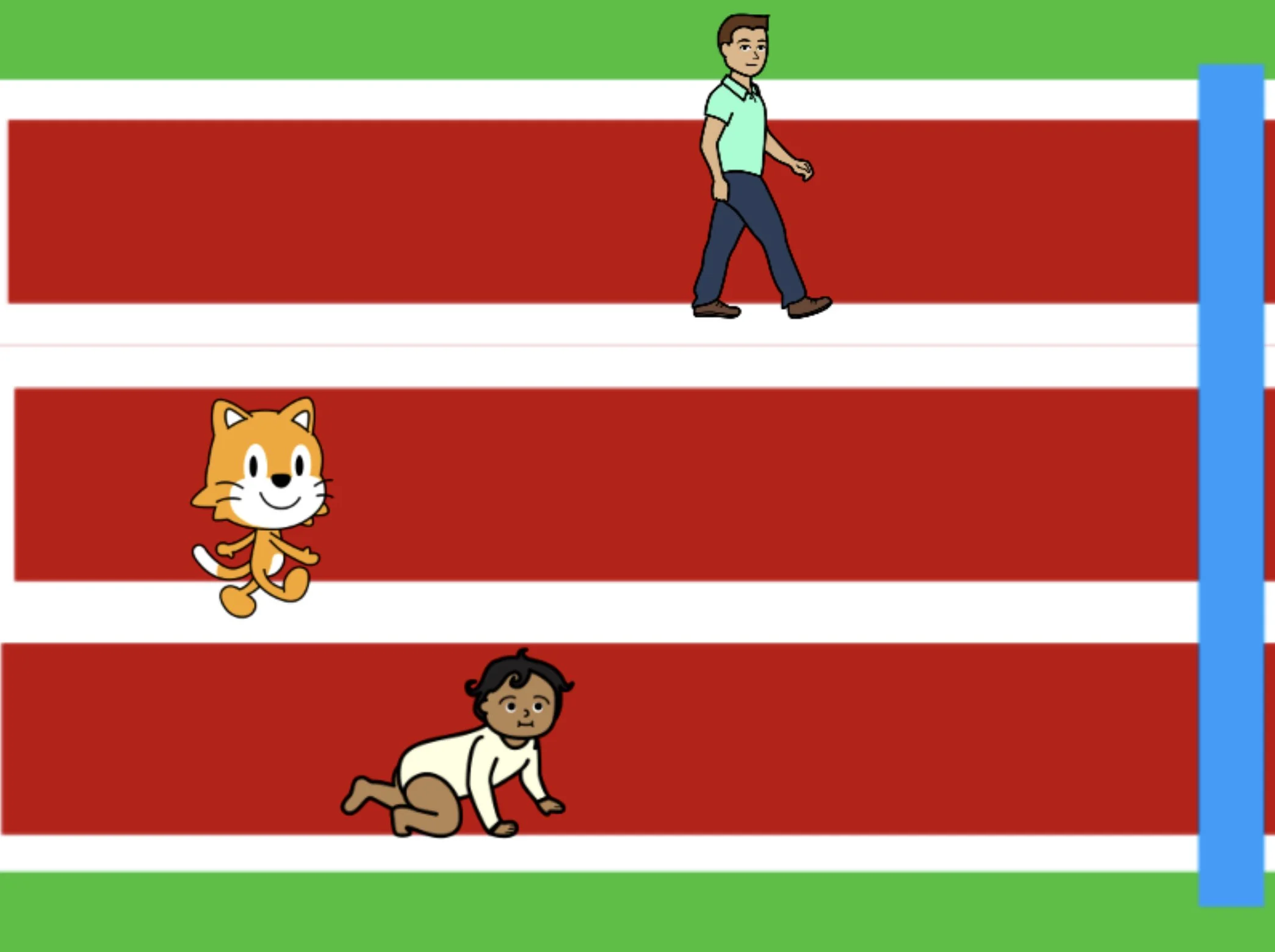Tres personajes se enfrentarán a una carrera de atletismo. Deberán cruzar la pista lo más rápido que puedan pero solo uno será el vencedor.